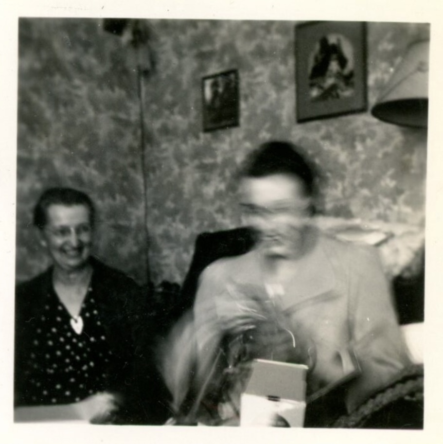 Everyone’s smiling, except one woman in the corner—blurry, pale, staring at the lens.